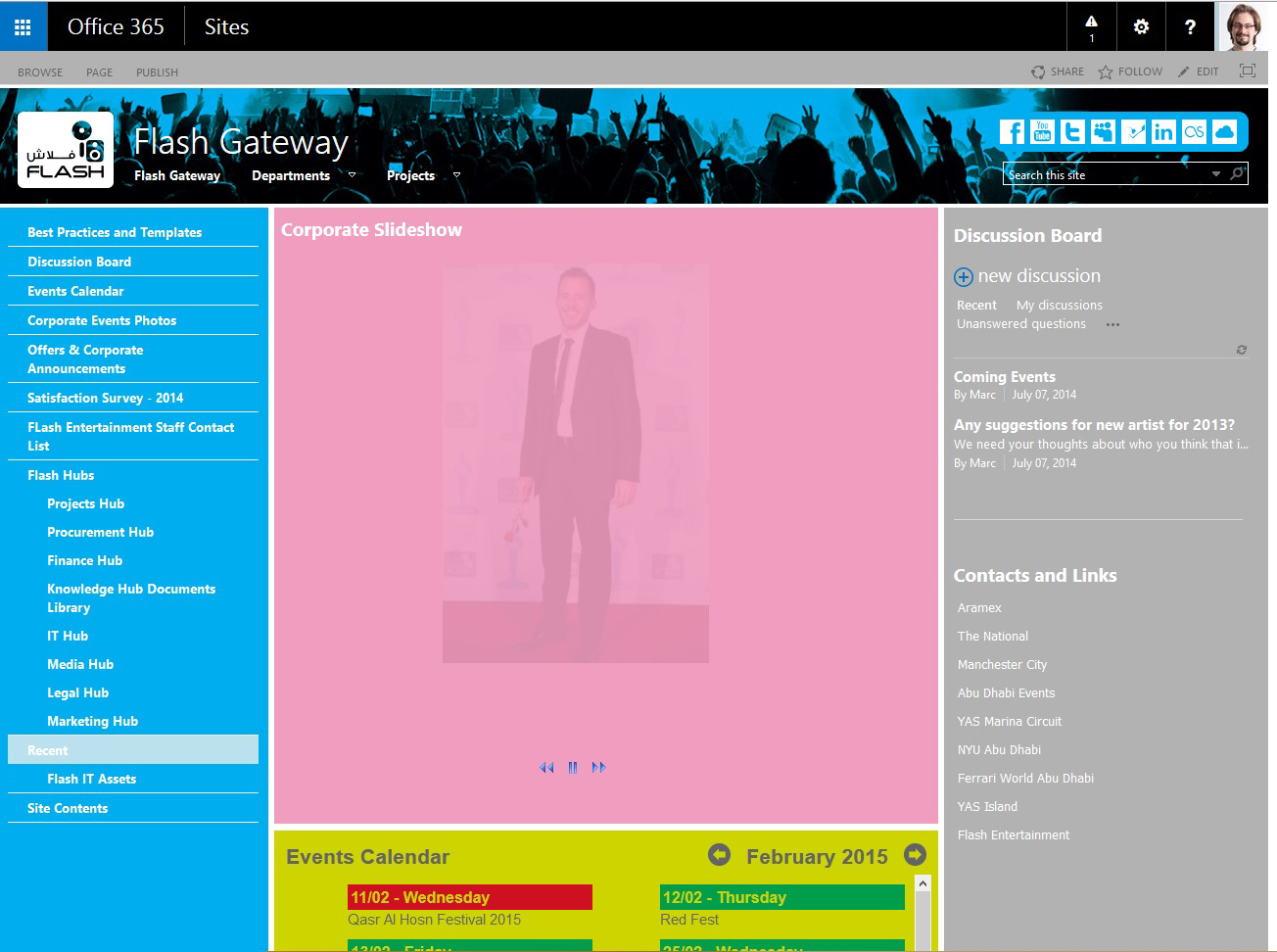 Flash Entertainment wanted to increase the utility and engagement of their corporate intranet. The website needed to connect better with its audience by surfacing time sensitive information, an intuitive information architecture, better internal collaboration, and a more coherent visual language that followed the corporate brand.