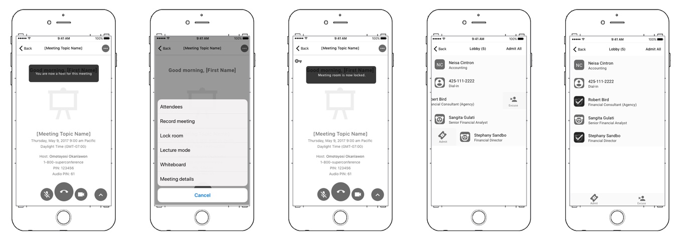 For the wireframe concepts there were several ways a user could get into a virtual meeting. A virtual meeting could be scheduled, or the user could start or be invited into an ad hoc meeting. The latter could be accomplished from a chat or an active audio or video call.