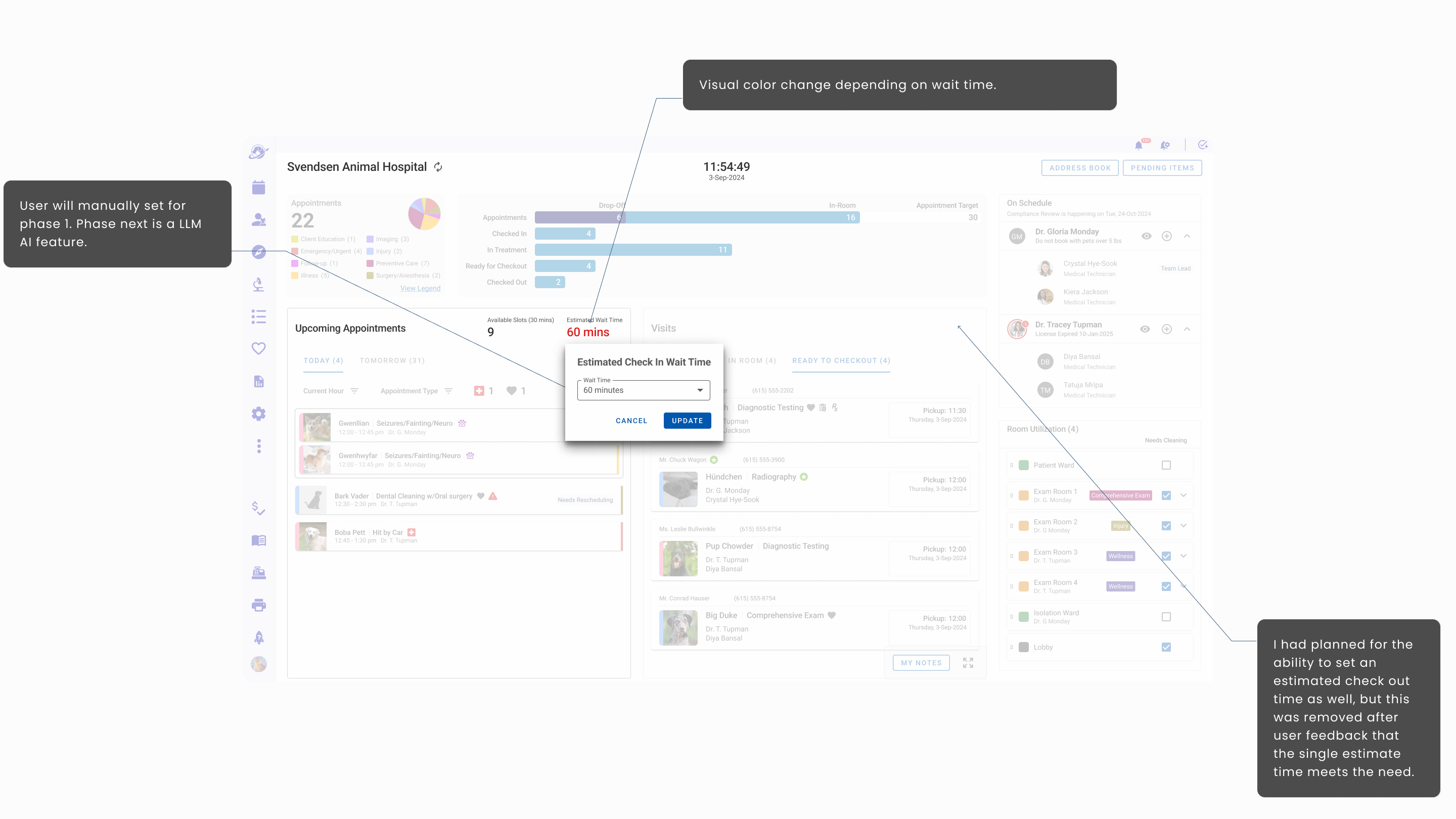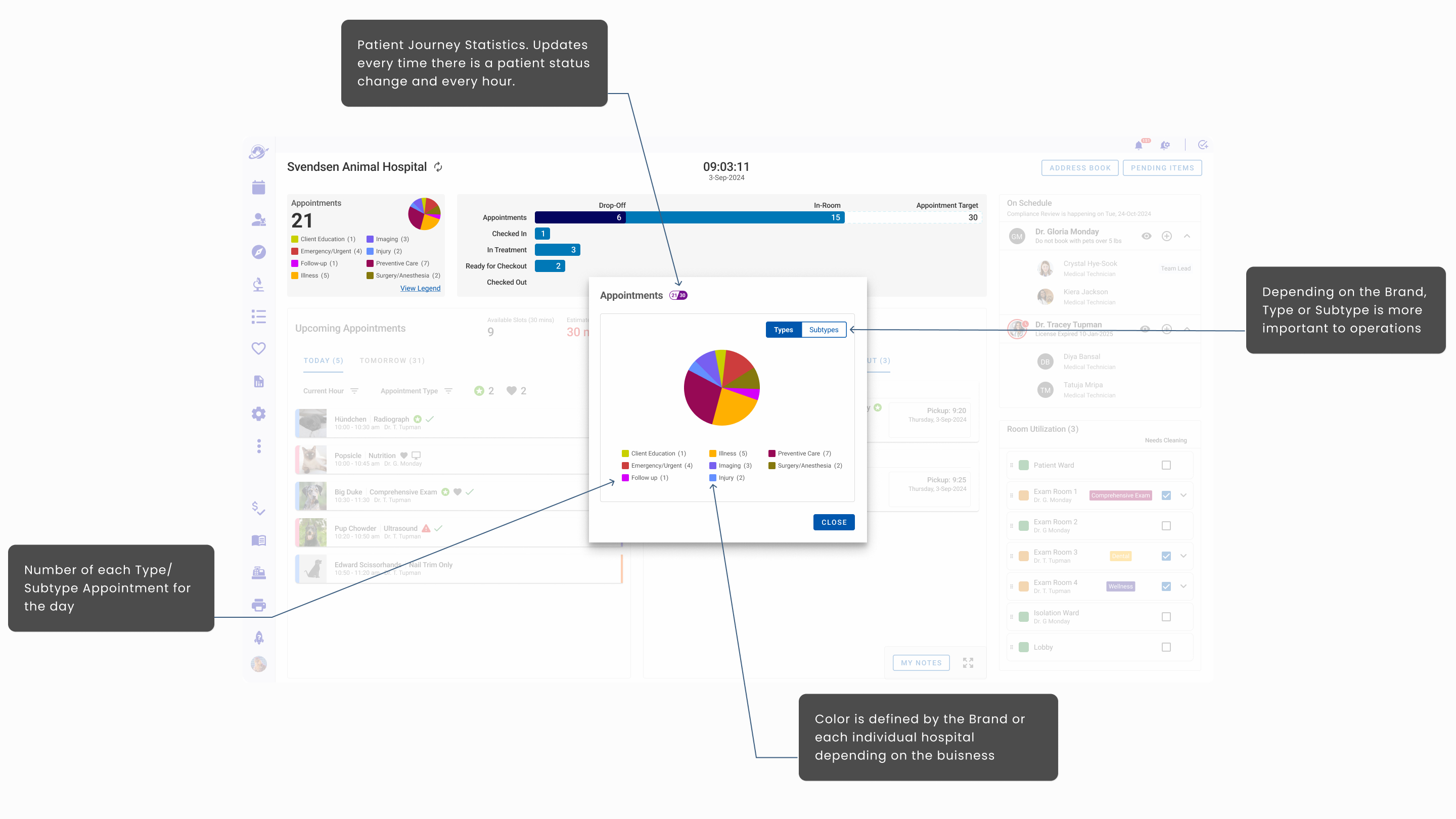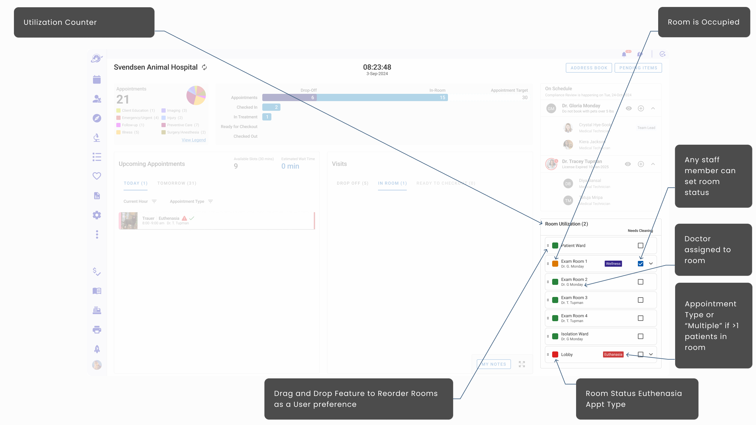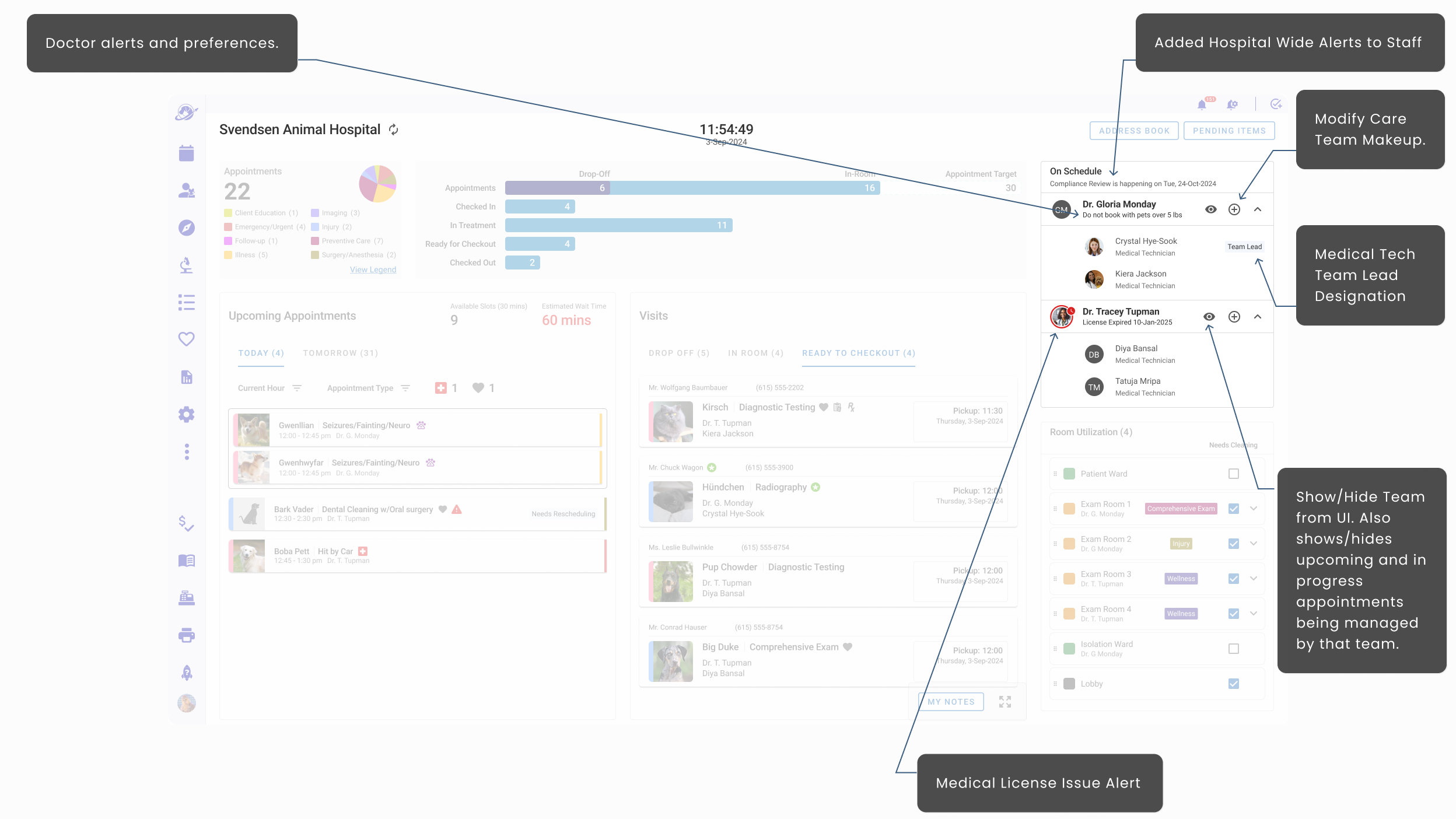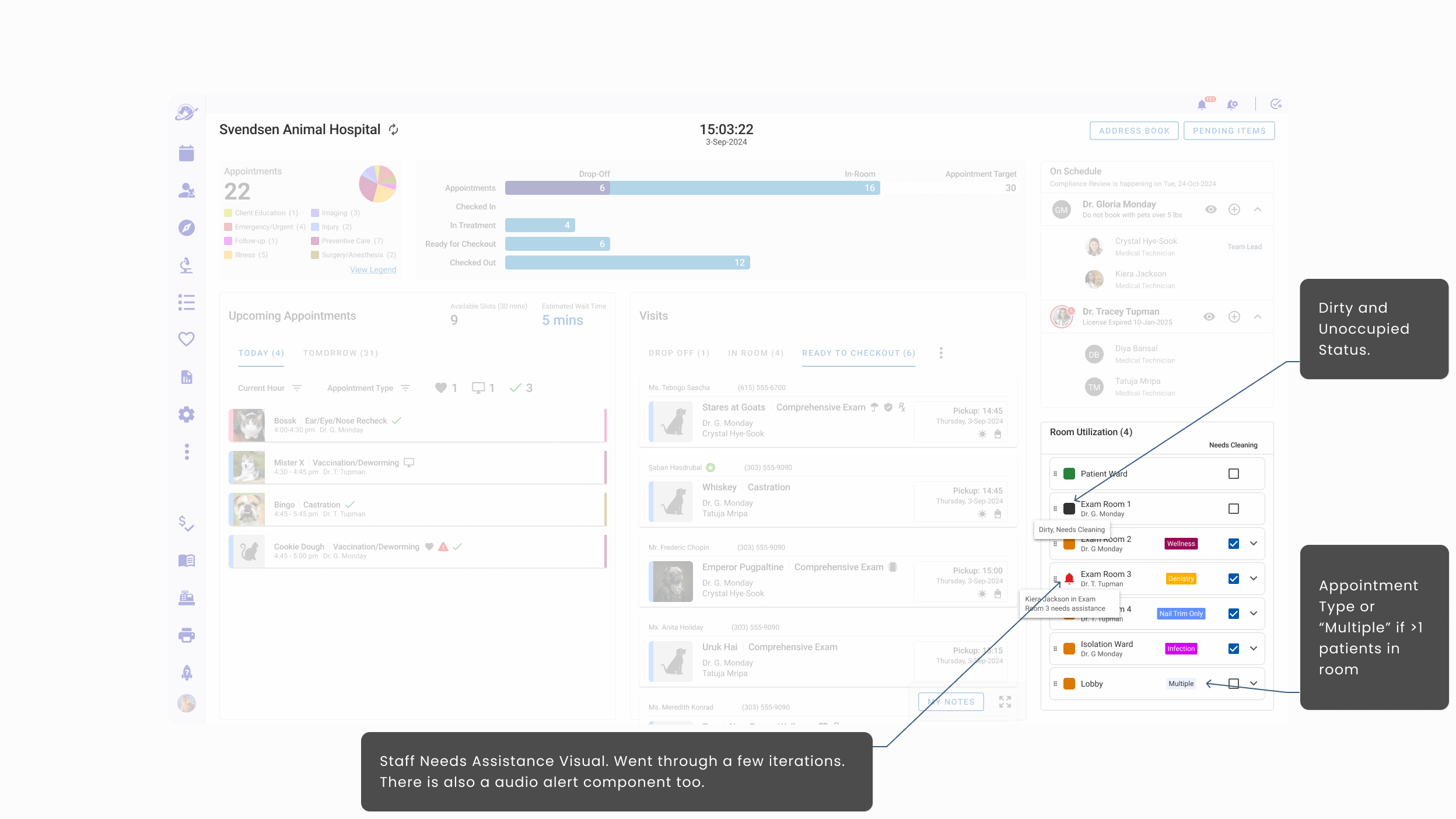 - Hoteling Status that informed staff which rooms were available, needed attention, shuttered, and assigned to specific veterinarians