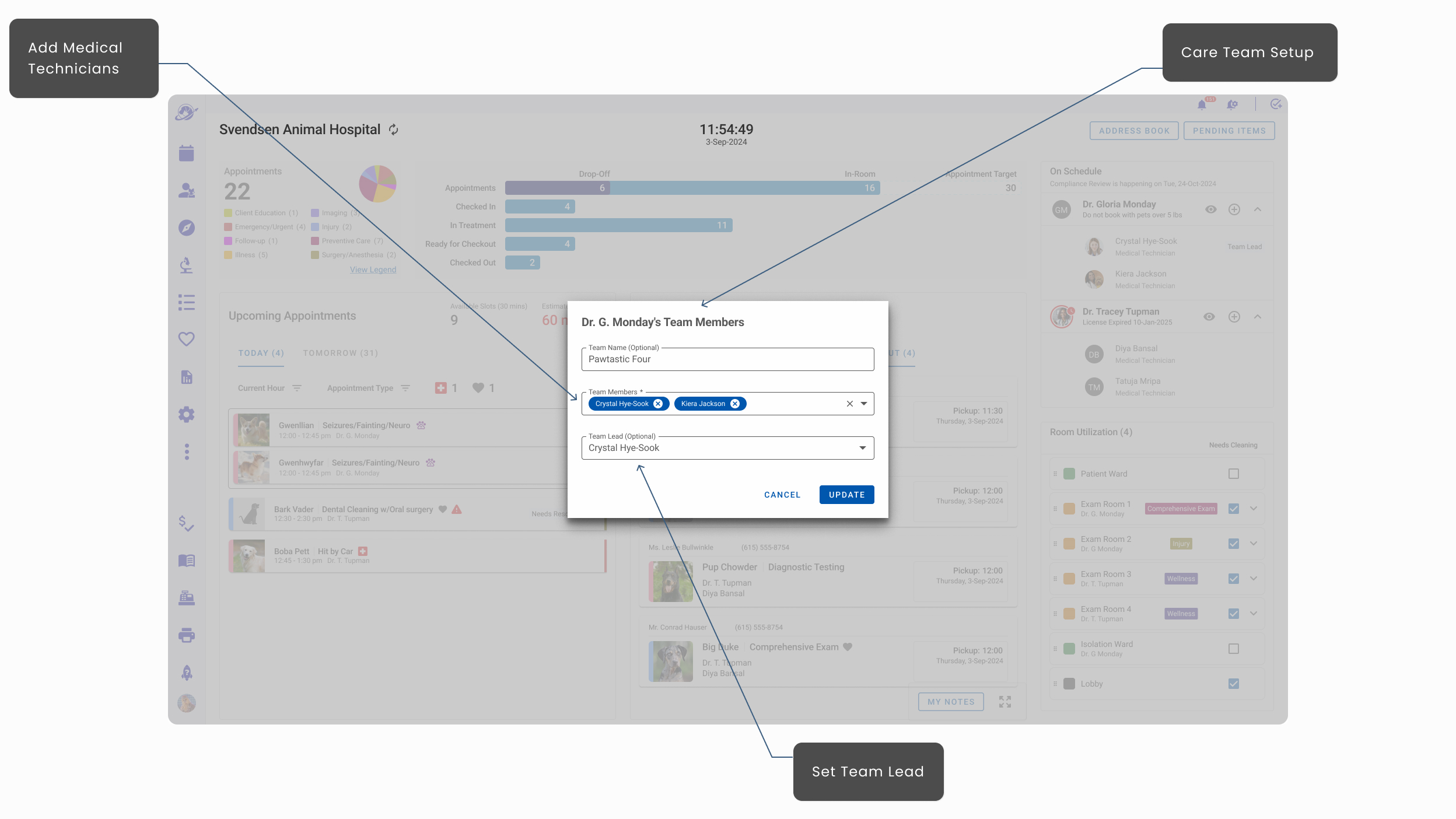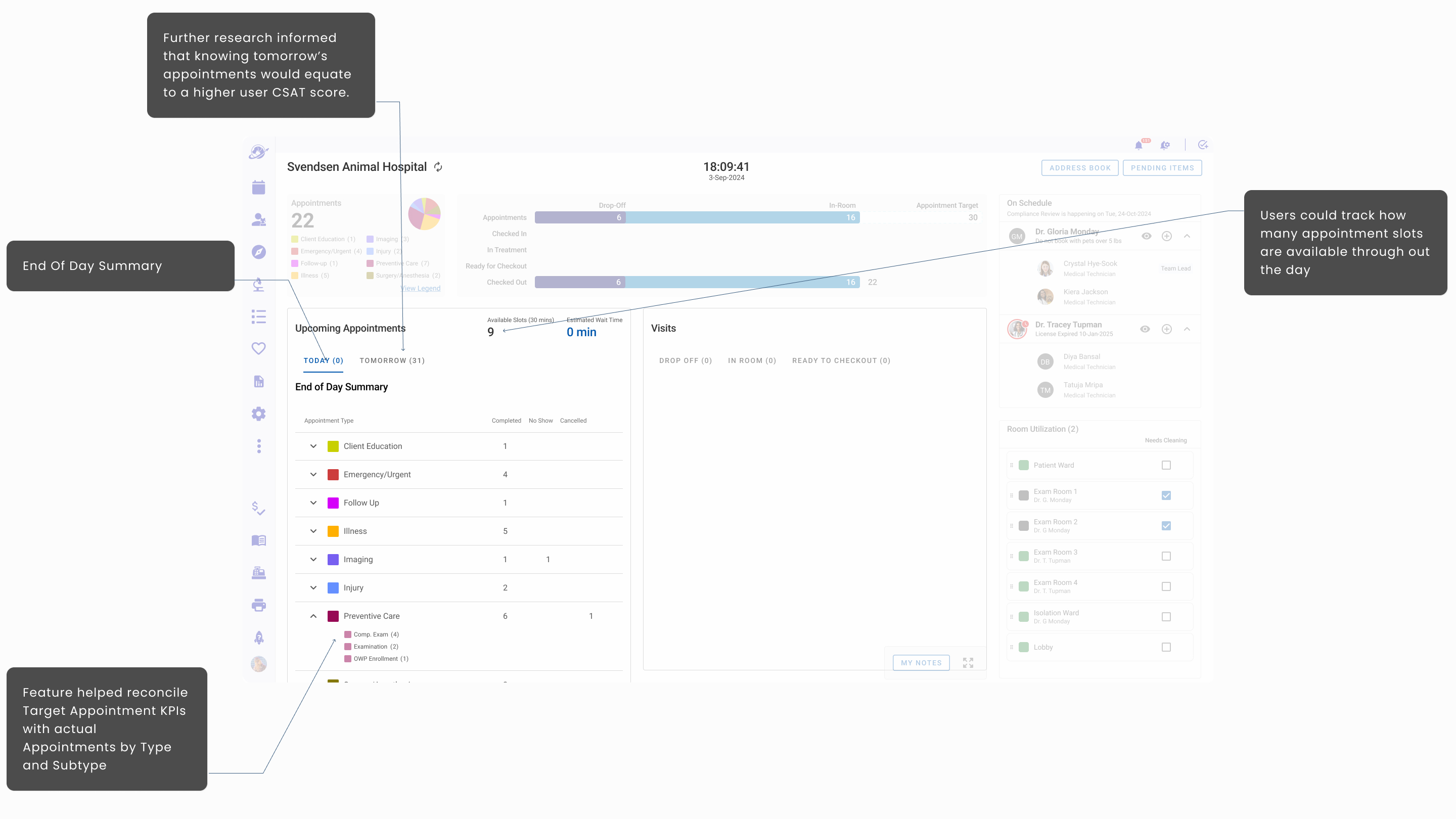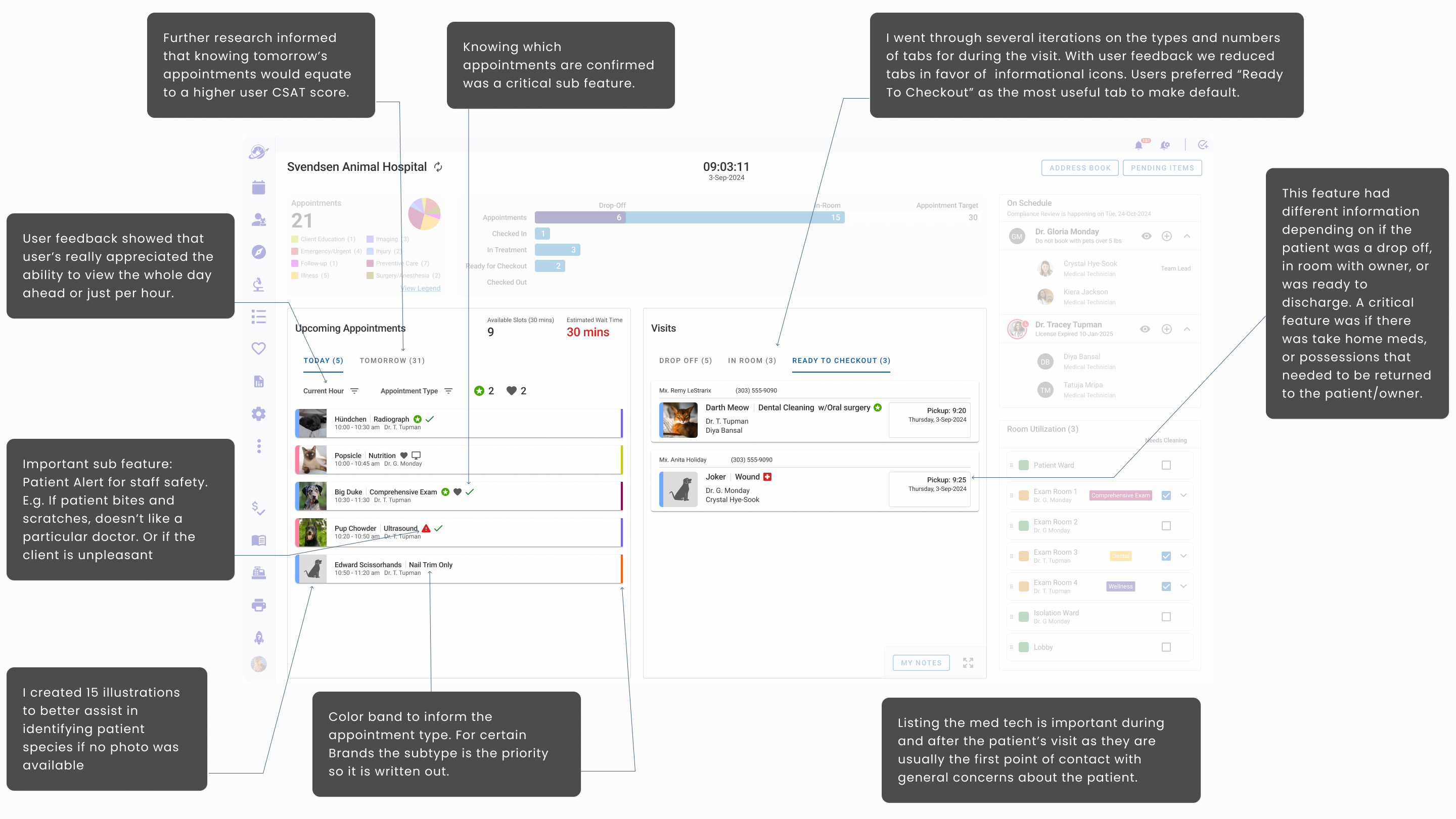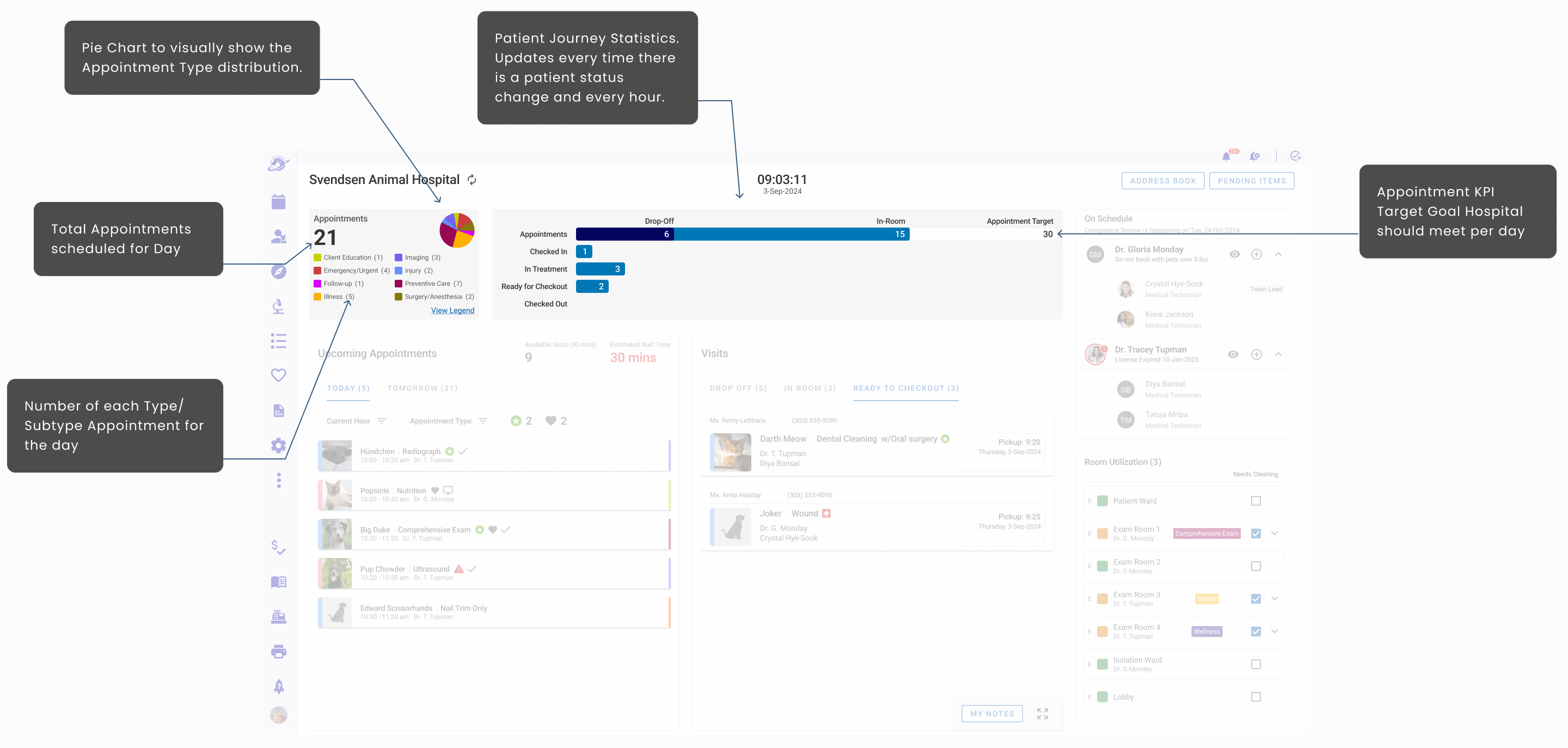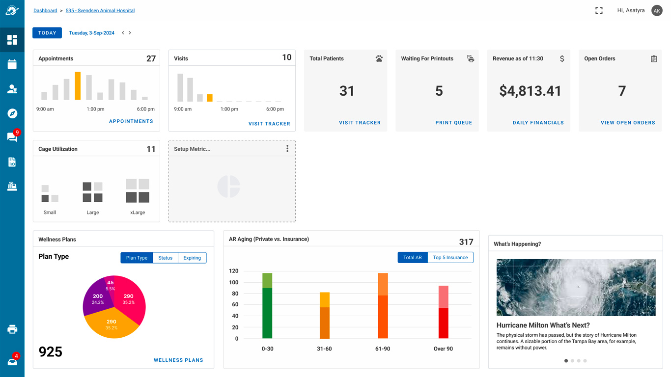 - Hoteling Status that informed staff which rooms were available, needed attention, shuttered, and assigned to specific veterinarians