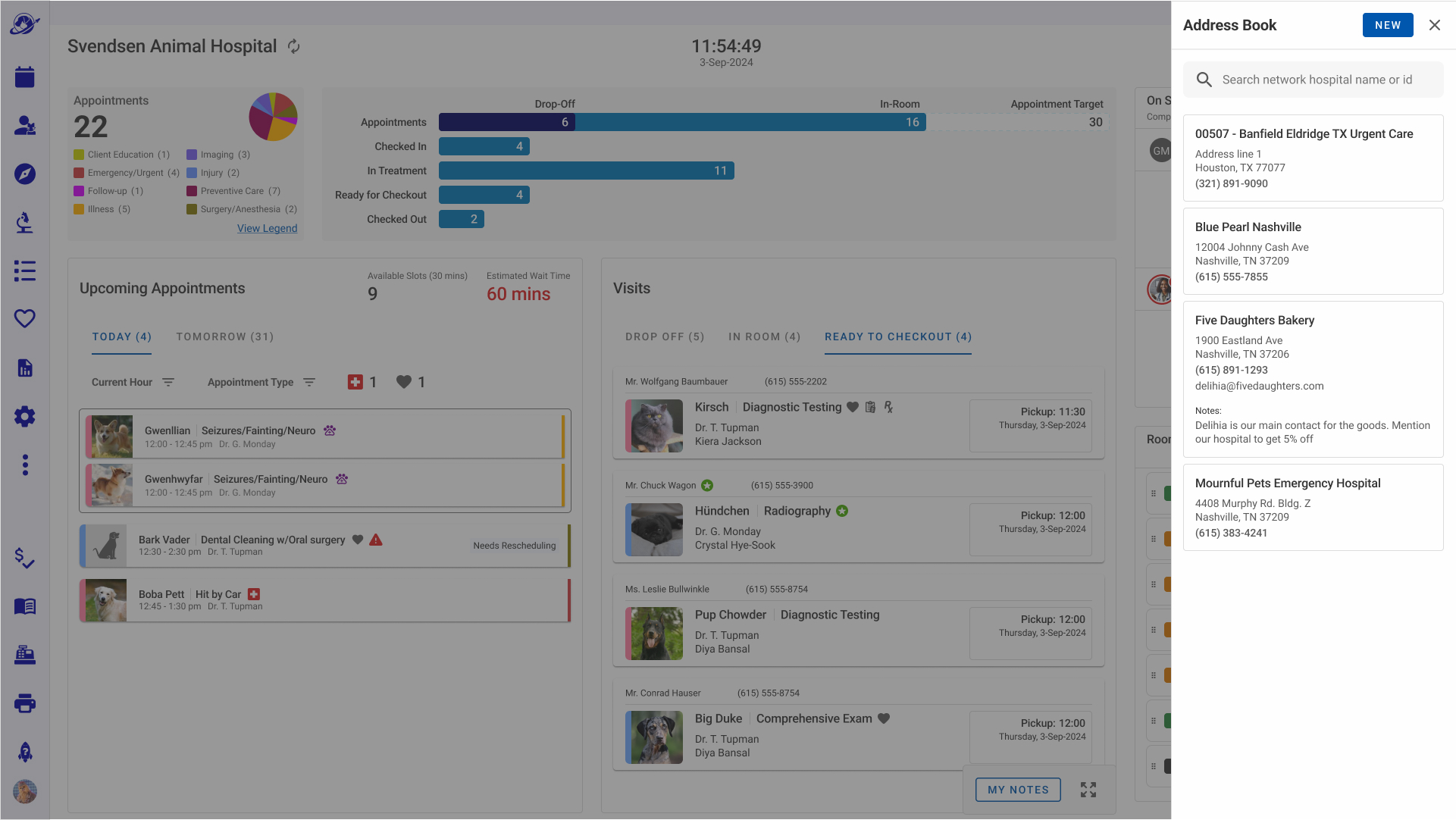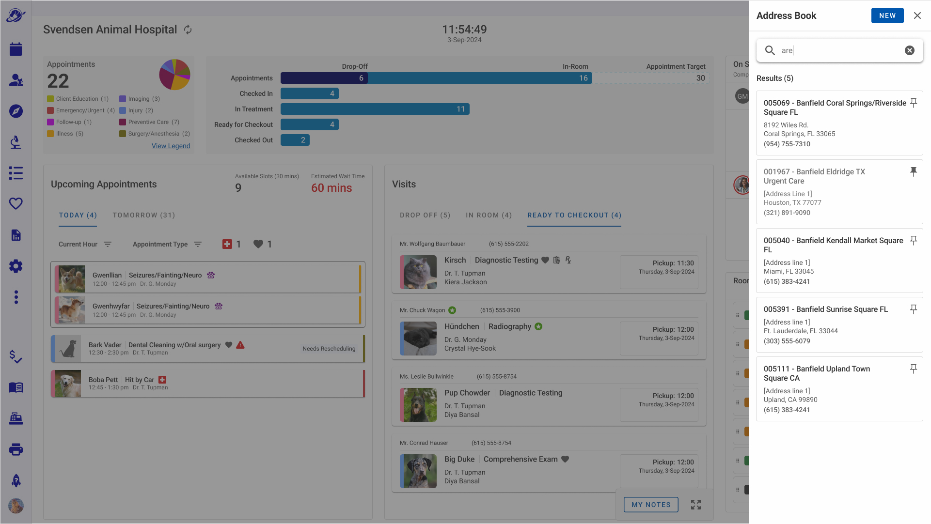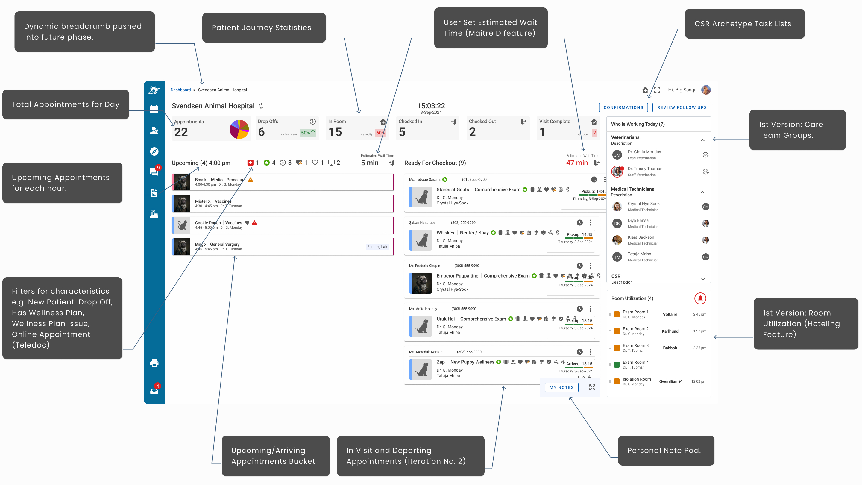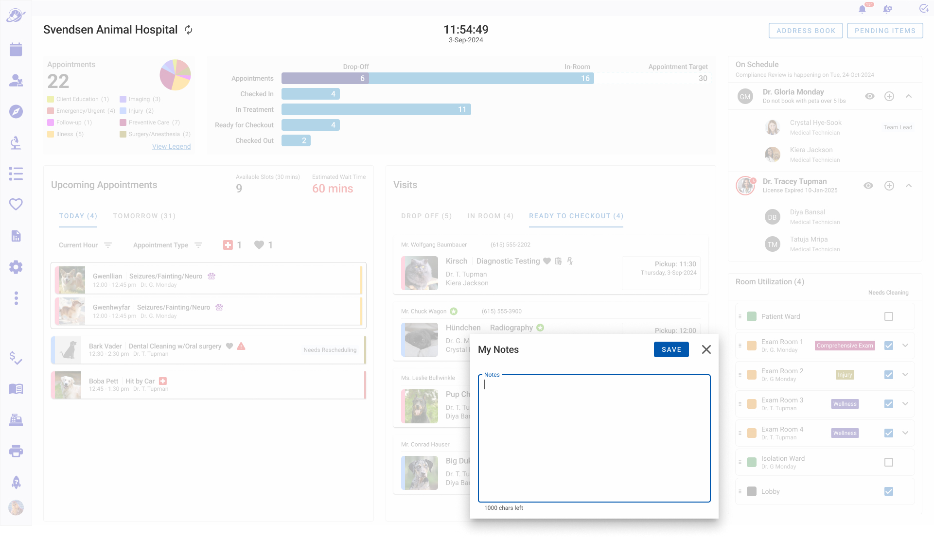 - Hoteling Status that informed staff which rooms were available, needed attention, shuttered, and assigned to specific veterinarians