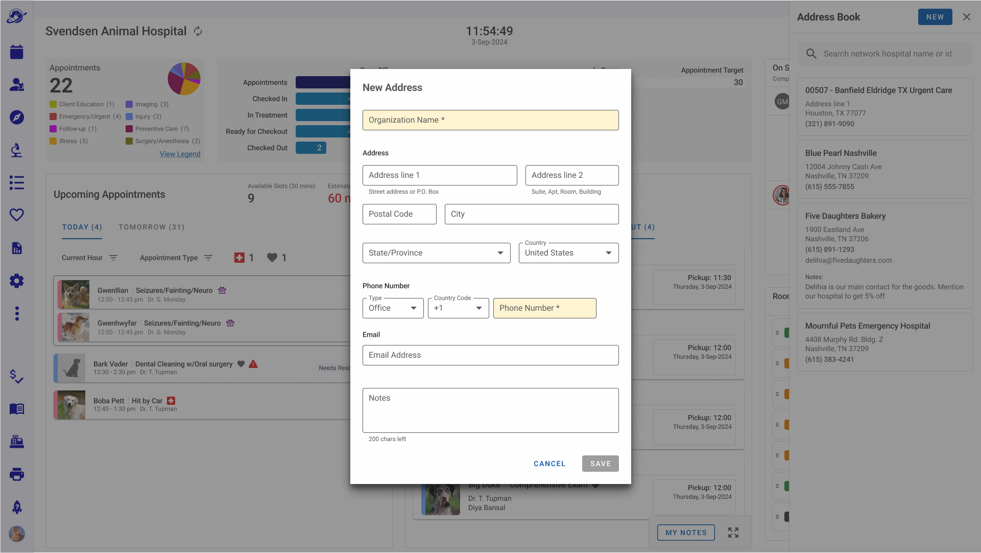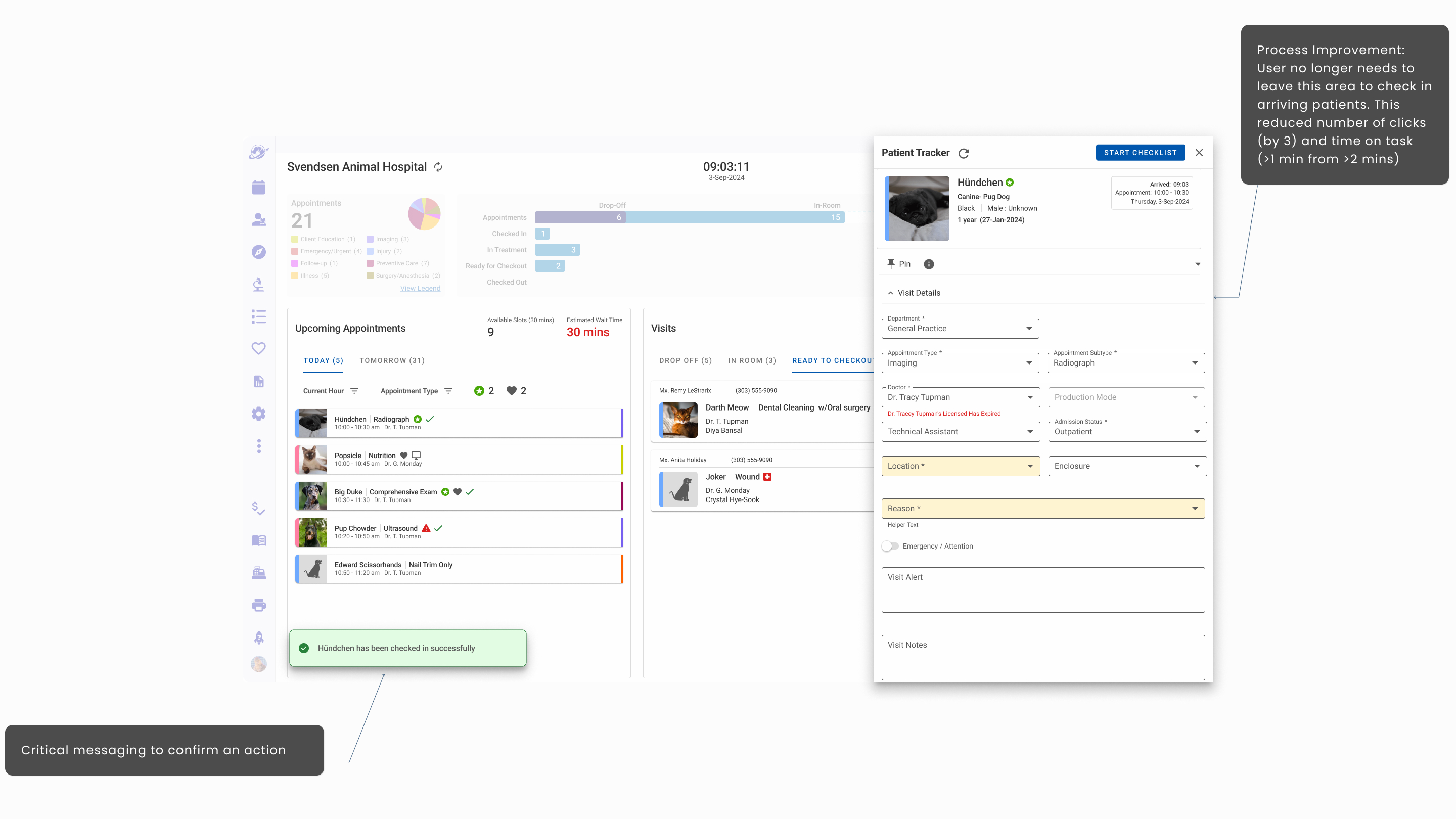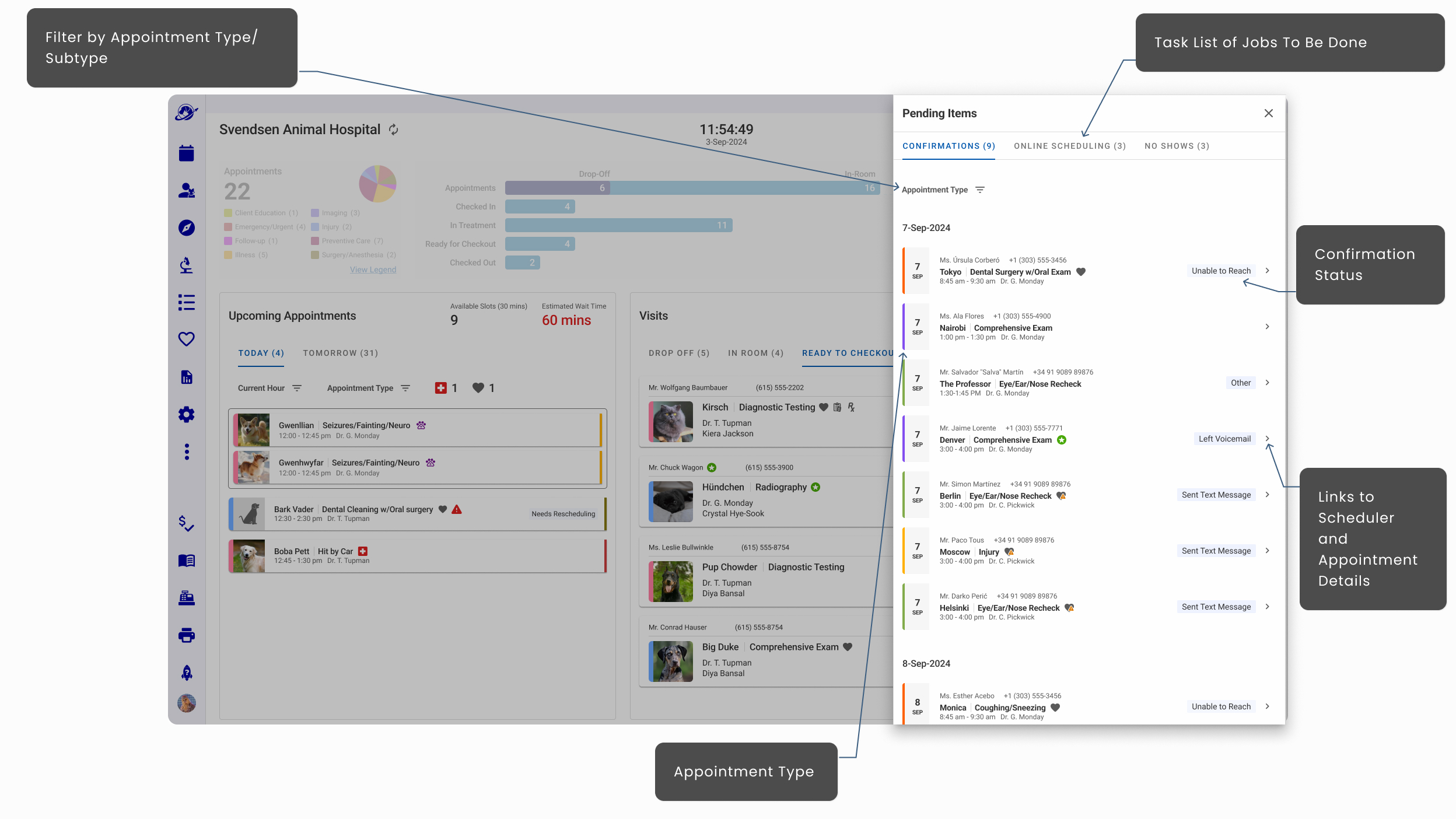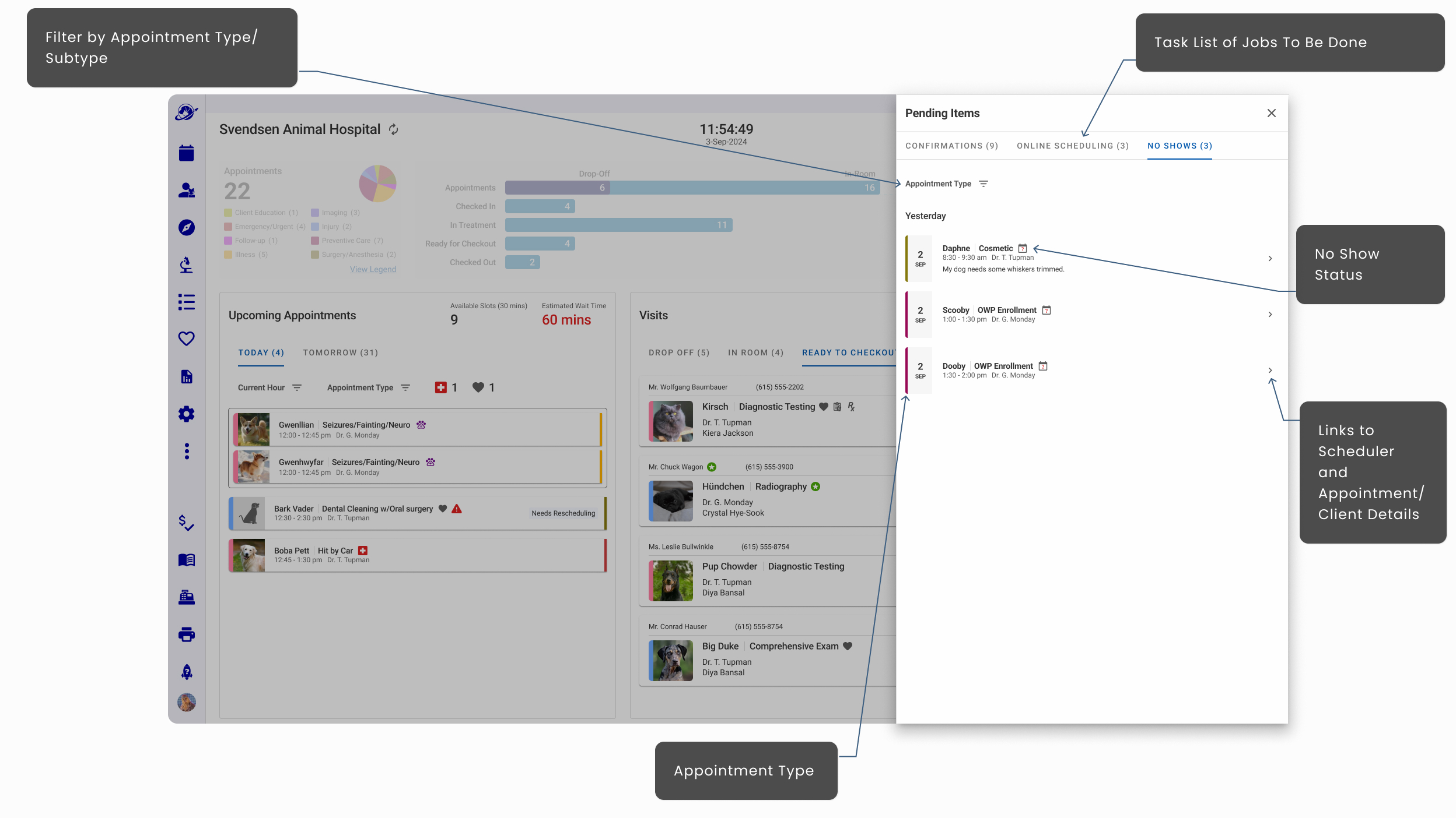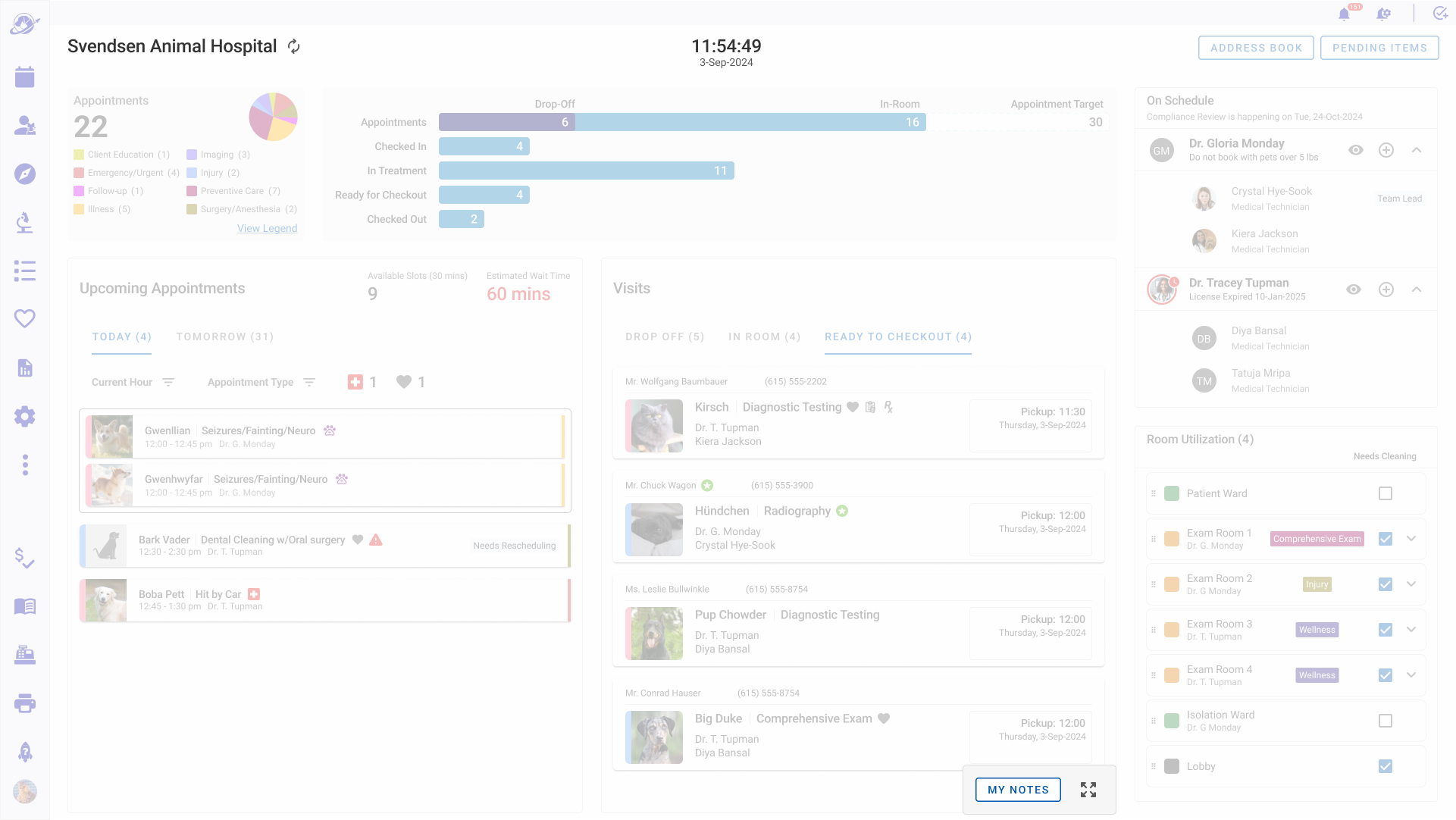 - Hoteling Status that informed staff which rooms were available, needed attention, shuttered, and assigned to specific veterinarians