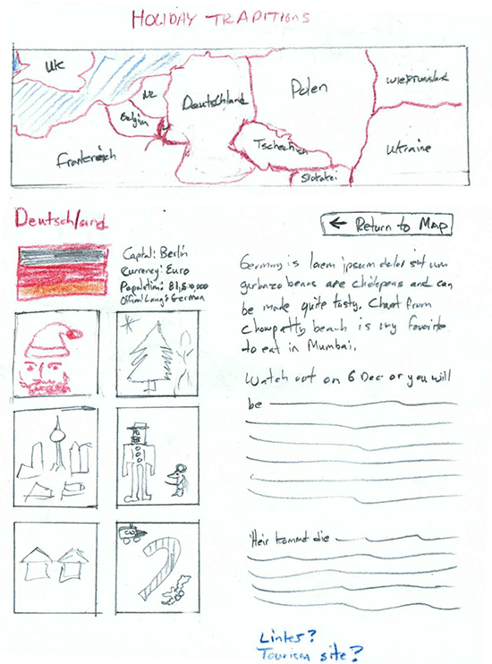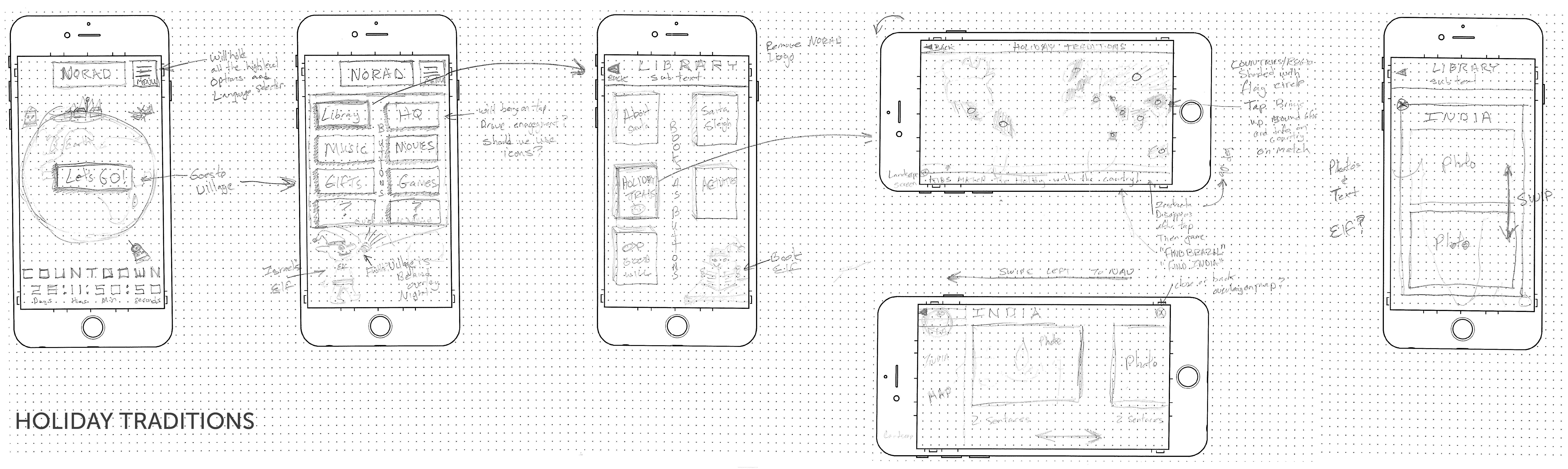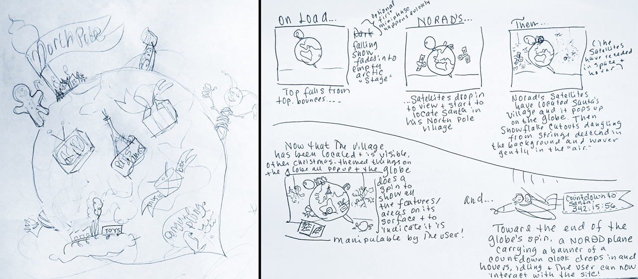The wireframes and storyboards drawn by my colleague Abigail incorporated a globe filled with interactive Christmas objects that the audience could select to explore different sections of the website. This was also touch friendly for iPad and Surface users.