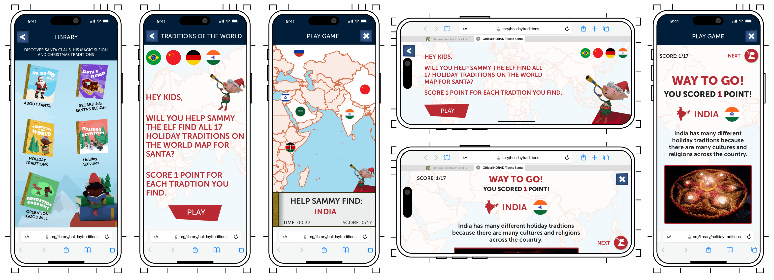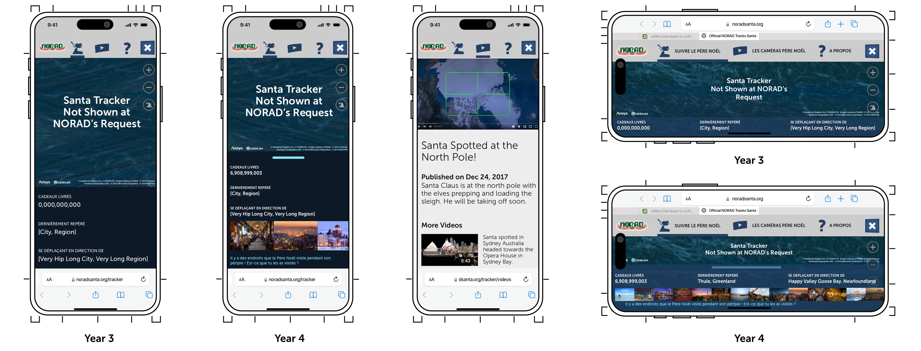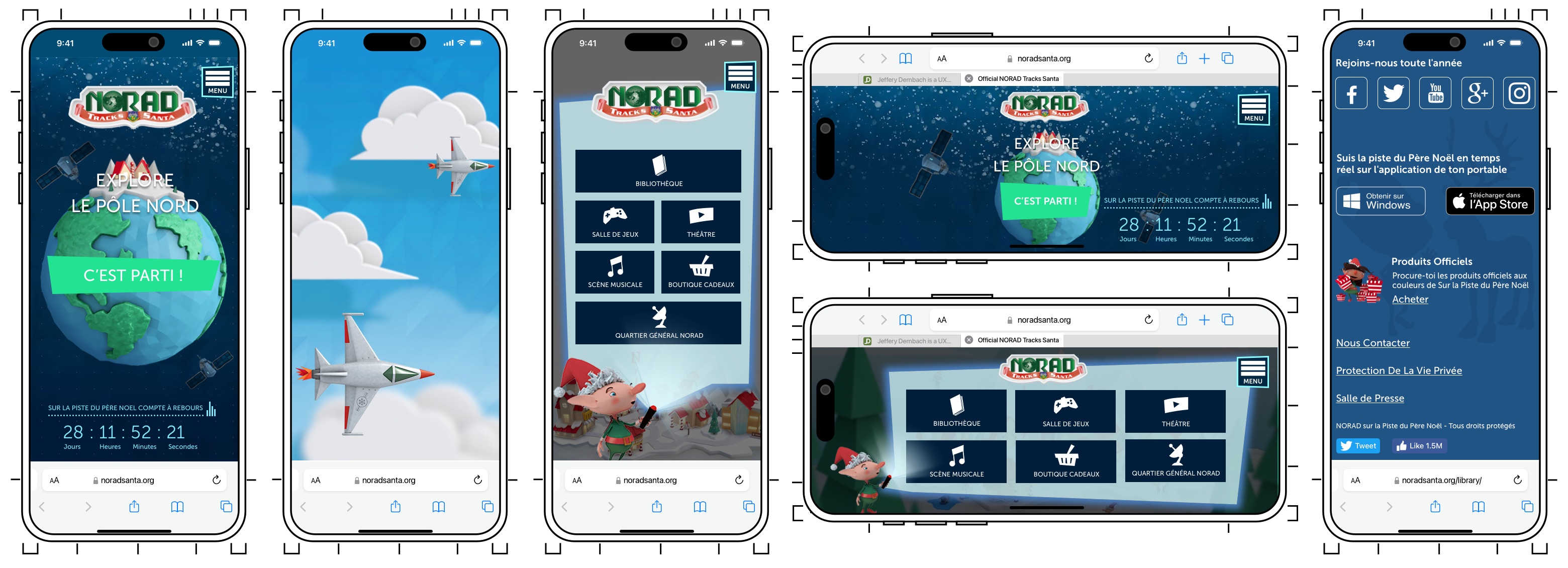 While Israel was working on the 3D models, I designed the responsive experience in three phases over the design sprints. The phased approach was to also provide a design system for the Santa tracker and native mobile partners, so they had time to integrate the designs into their respective areas. I used French and German content in the mobile designs for layout and spacing of labels, content, and UI control design.