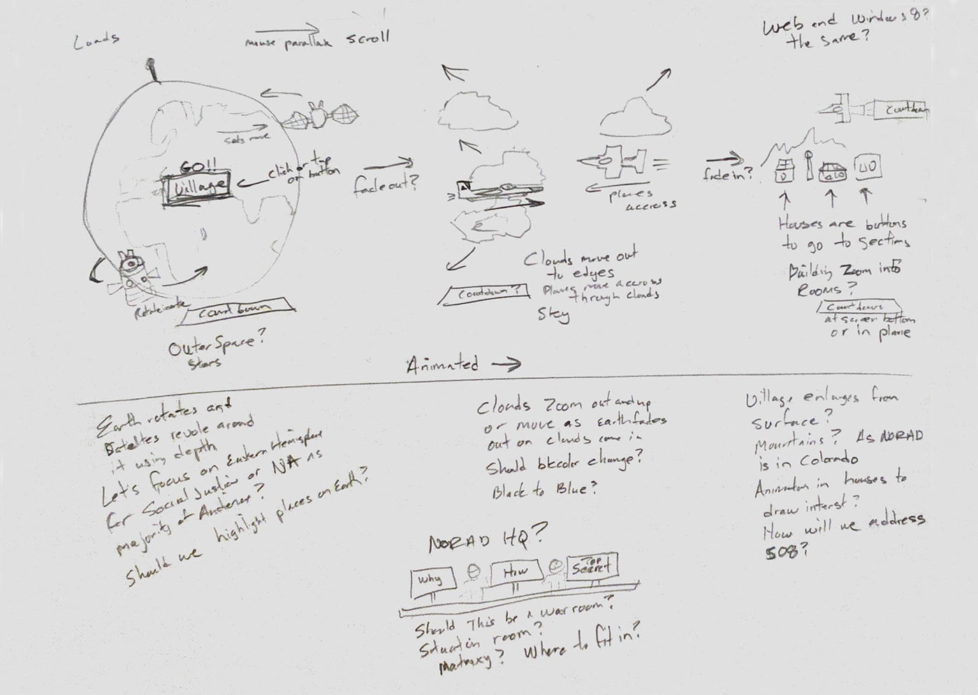 In the creative discussions we decided to build off the globe and start the experience from Outer Space and as the user interacts the animation will zoom into Inner Space and then ending on a North Pole village. Within each of these scenes we could integrate animated satellites and jet fighters as well. I took some inspiration by “the Simpsons” opening credits where the town of Springfield comes into view through the clouds and decided to take this a step further and sketched out a new design.