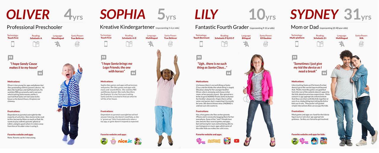 NORAD was amused and surprised with the age demographic findings from our report. We created some personas that we shared out to all the partners as part of the research deliverable report. Sophia and Oliver became the two primary audience members we were going to target our experience for. Lily represented an older sibling and Sydney represented the guardian persona. We used the personas as a guide when reflecting on design decisions and adhering to U.S. COPPA guidelines.