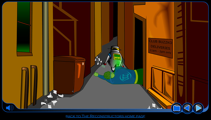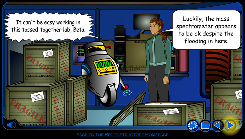 As one of the original researchers and designers of the Reconstructors, my primary design role was to set the overall visual and interaction design patterns for the series. Considering the technology available and genre's popular of the time we chose an animated comic book panel style. The researches and educators liked the work I had done with the digital based comic cards on Marvel In Motion.