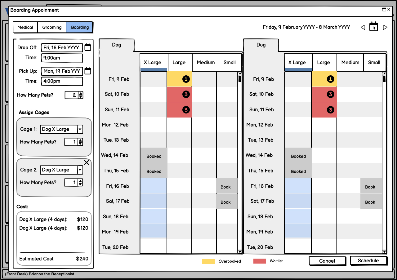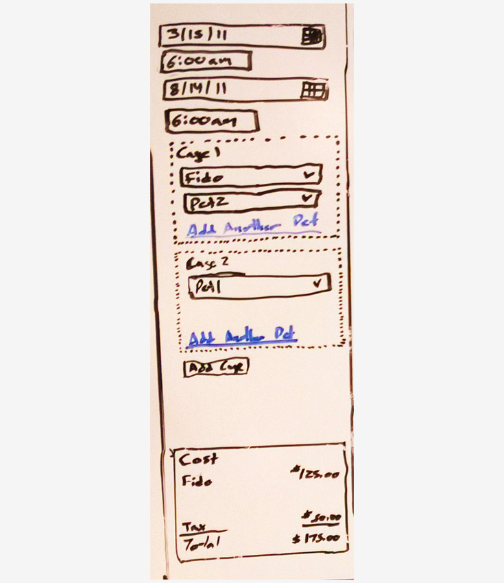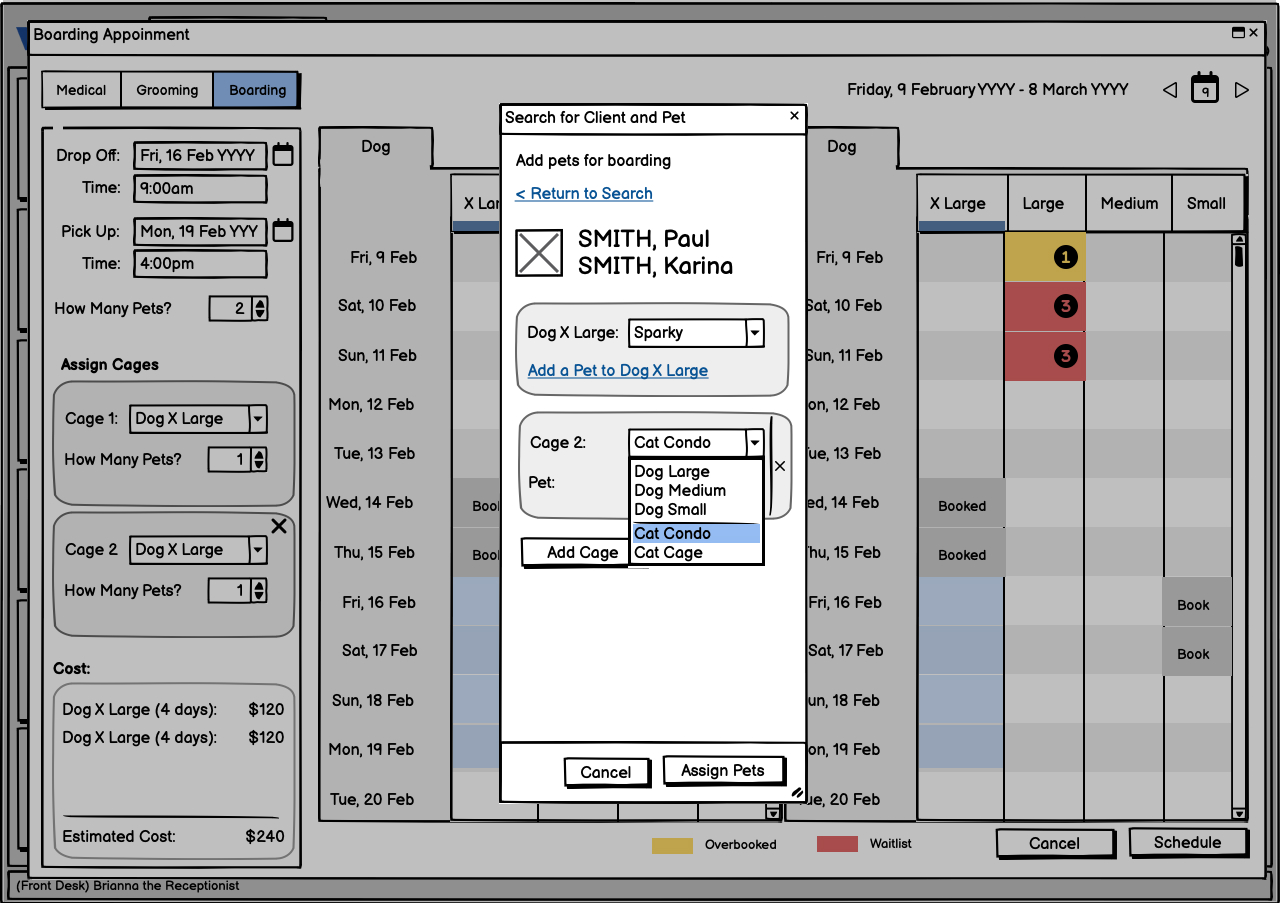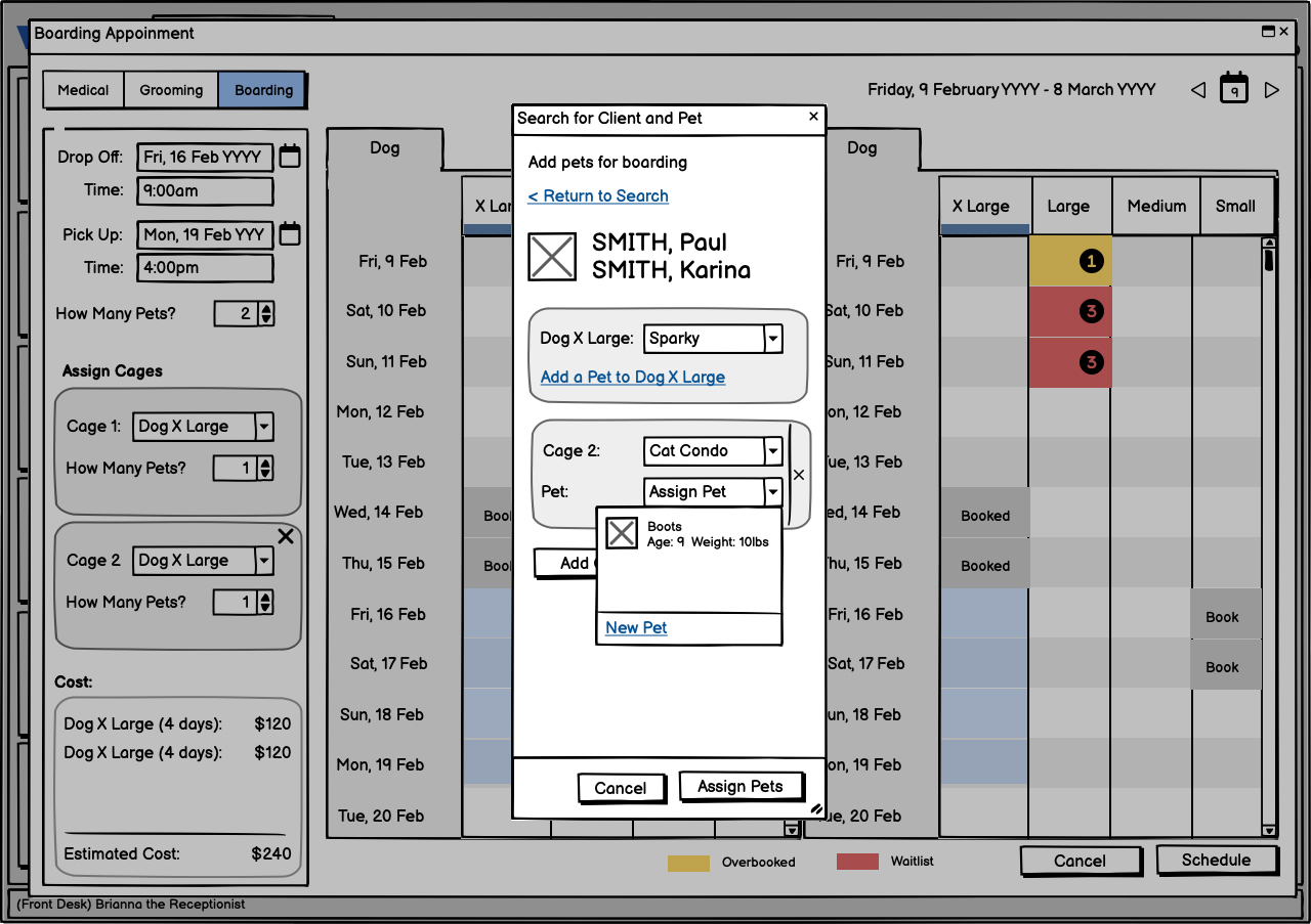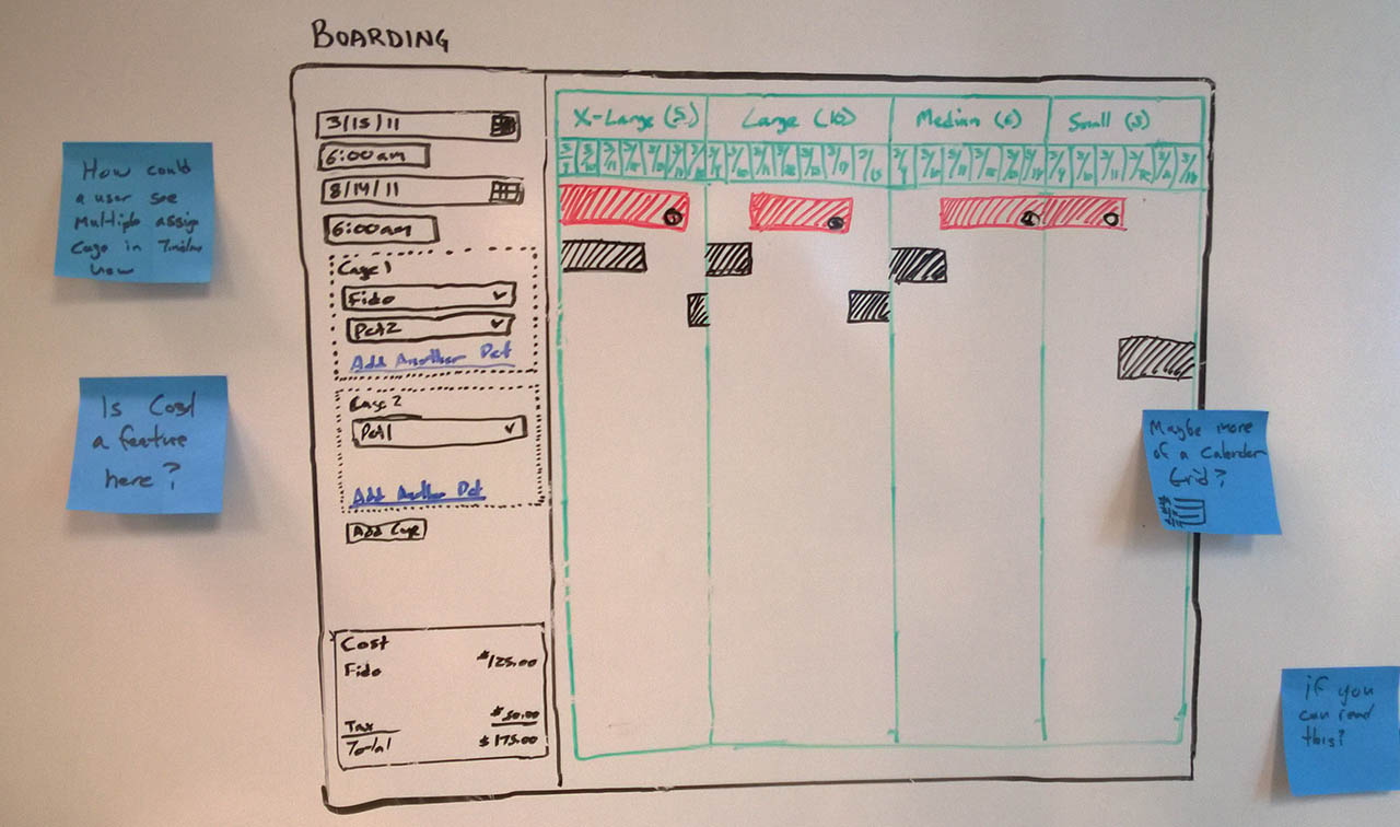 Iterating on the design through usability testing with Brianna and Rose achieved the goals of reducing the learning curve and speed of getting the information they needed. Iterating on the missed opportunities like total cage capacity over a day/week/month at a glance and cage placement suggestions the user was able to accurately and quickly get a boarding price quote to a customer through fewer interactions.