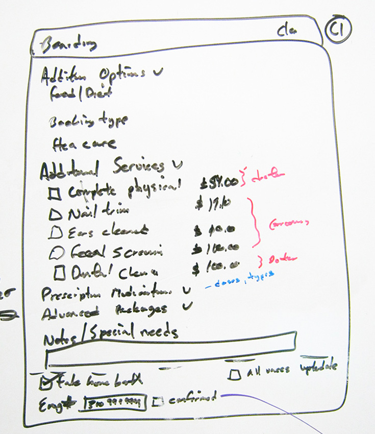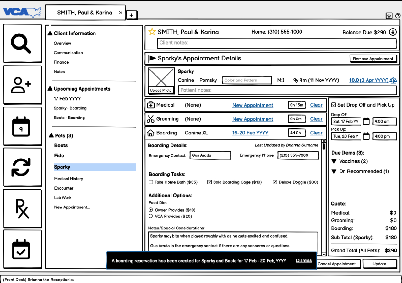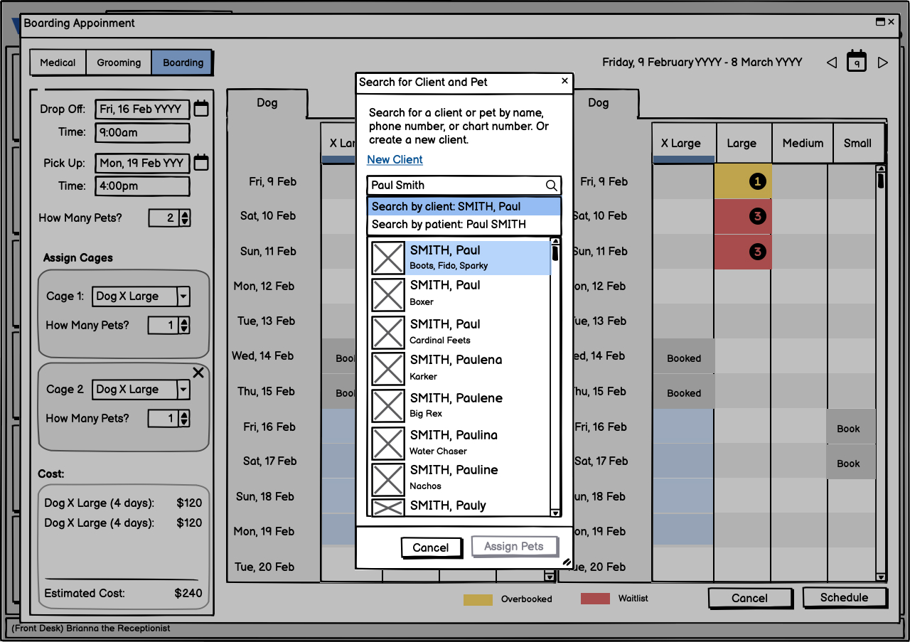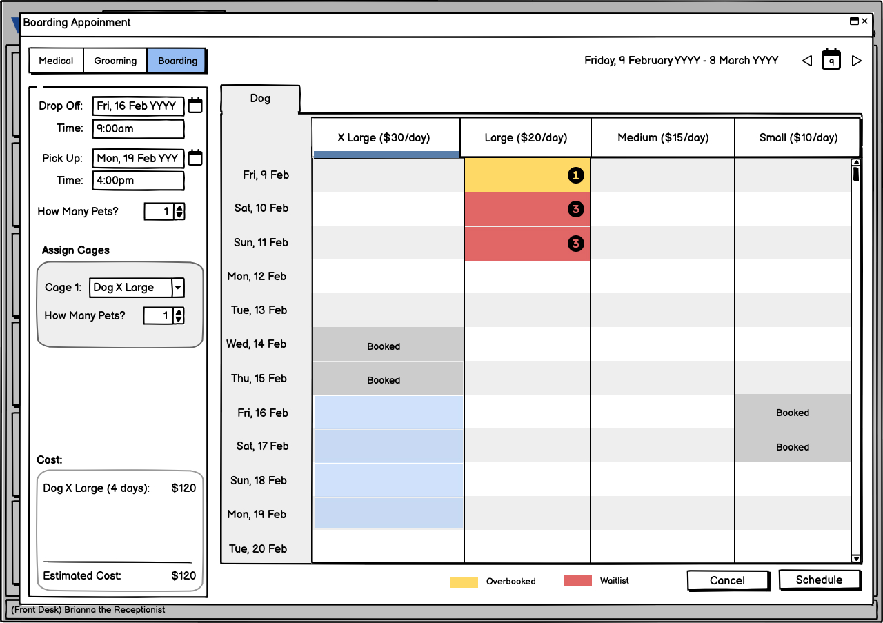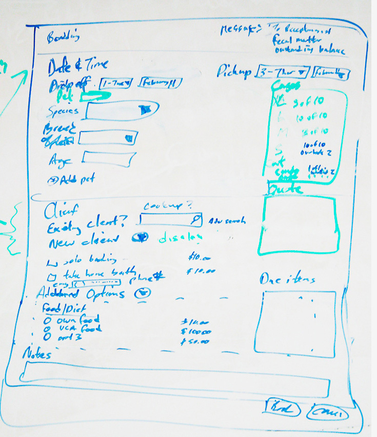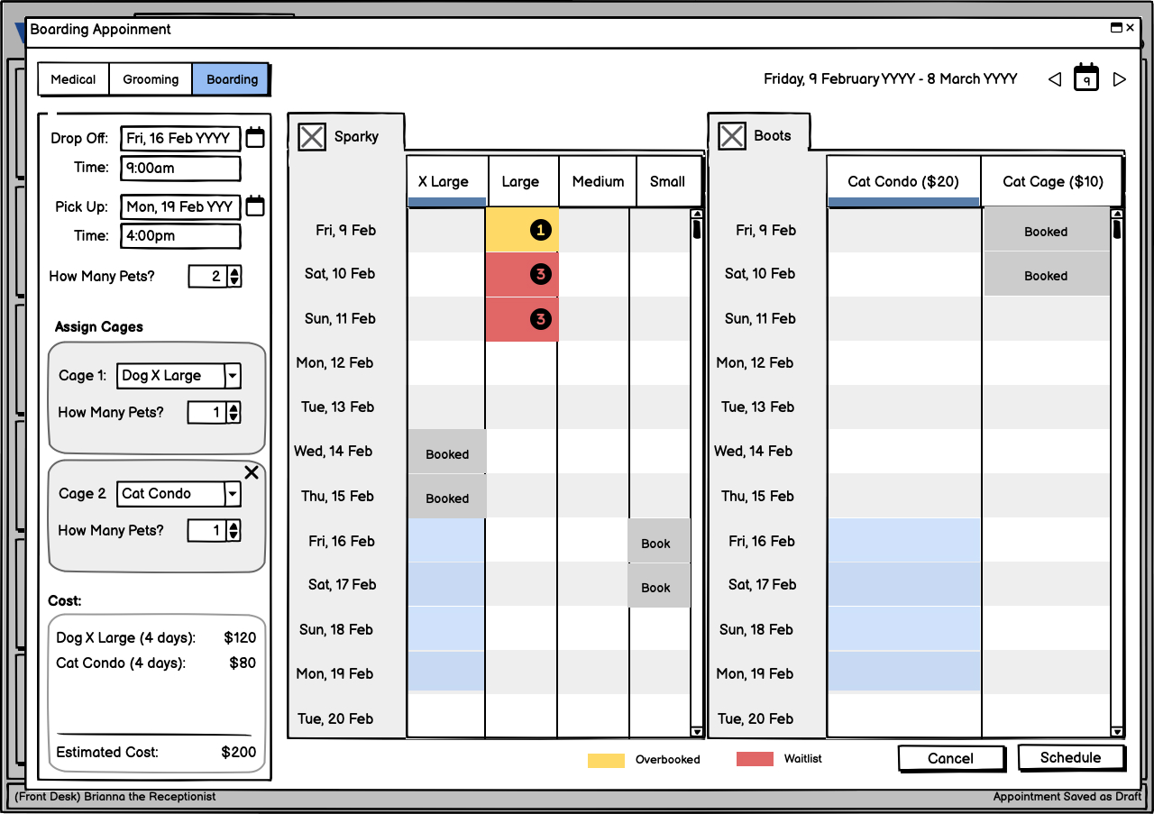 Iterating on the design through usability testing with Brianna and Rose achieved the goals of reducing the learning curve and speed of getting the information they needed. Iterating on the missed opportunities like total cage capacity over a day/week/month at a glance and cage placement suggestions the user was able to accurately and quickly get a boarding price quote to a customer through fewer interactions.